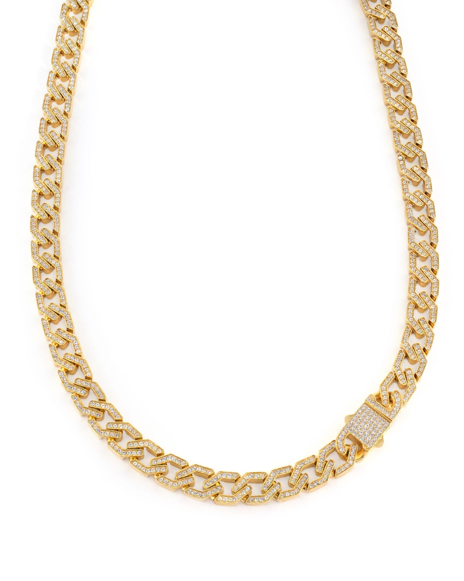 A corrente Ice com elos quadrados é uma deslumbrante joia que combina elegância e estilo em uma única peça. Esta corrente é cuidadosamente cravejada com zircônias cintilantes que capturam a luz de maneira deslumbrante, adicionando um toque de brilho e sofisticação ao seu visual. Seu design exclusivo apresenta elos quadrados, conferindo-lhe uma estética moderna e contemporânea.