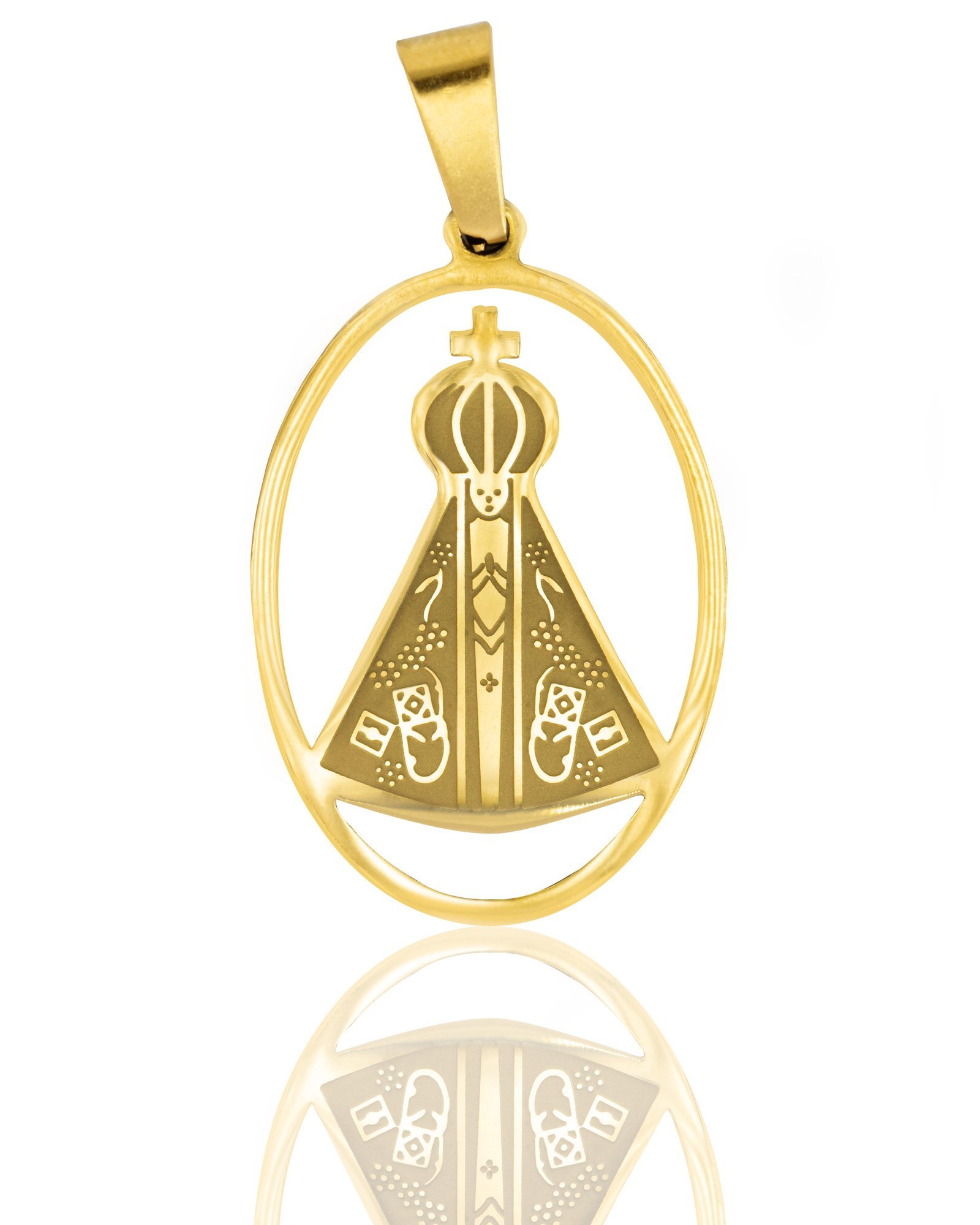 – 1 Pingente de Aço Inoxídavel Medalha de Nossa Senhora Vazada medindo 2cm de largura x 2,5cm de altura;